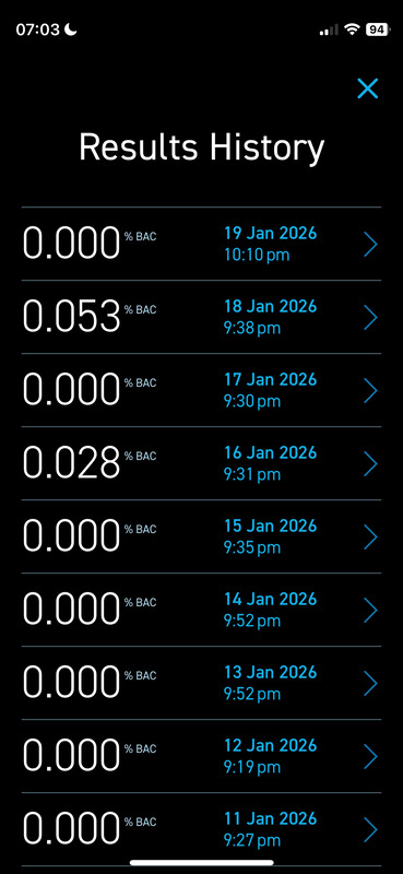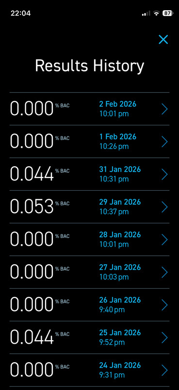 drink no more than 10 alcohol units per week with one drinking session generally not exceeding 50% of the total allowance - I will measure my blood alcohol content (BAC) with a BACtrack device each time 10 mins after my last drink and also take an added breathalyzer (accountability) test every day at 10.00 pm GMT, regardless whether I have drunk alcohol that day - 2 pre-agreed days of max. 14 units per day are allowed (including allowance for the rest of the week)